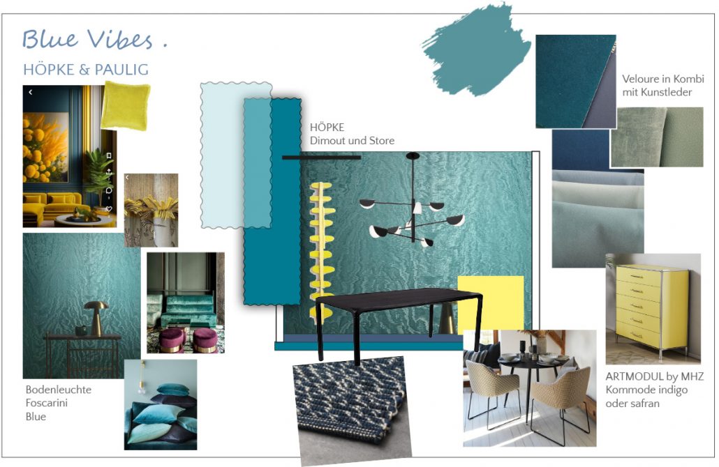 Blue Vibes präsentiert einen modernen Wohnstil in den unterschiedlichsten Blau-Nuancen. Mal mediterran und lässig interpretiert im Seaside Look, mal in einer modern luxuriösen Ästhetik in Kombination mit Jade, Akzenten in Safran und Schwarz-Weiss und immer einem Ausdruck von Lifestyle.