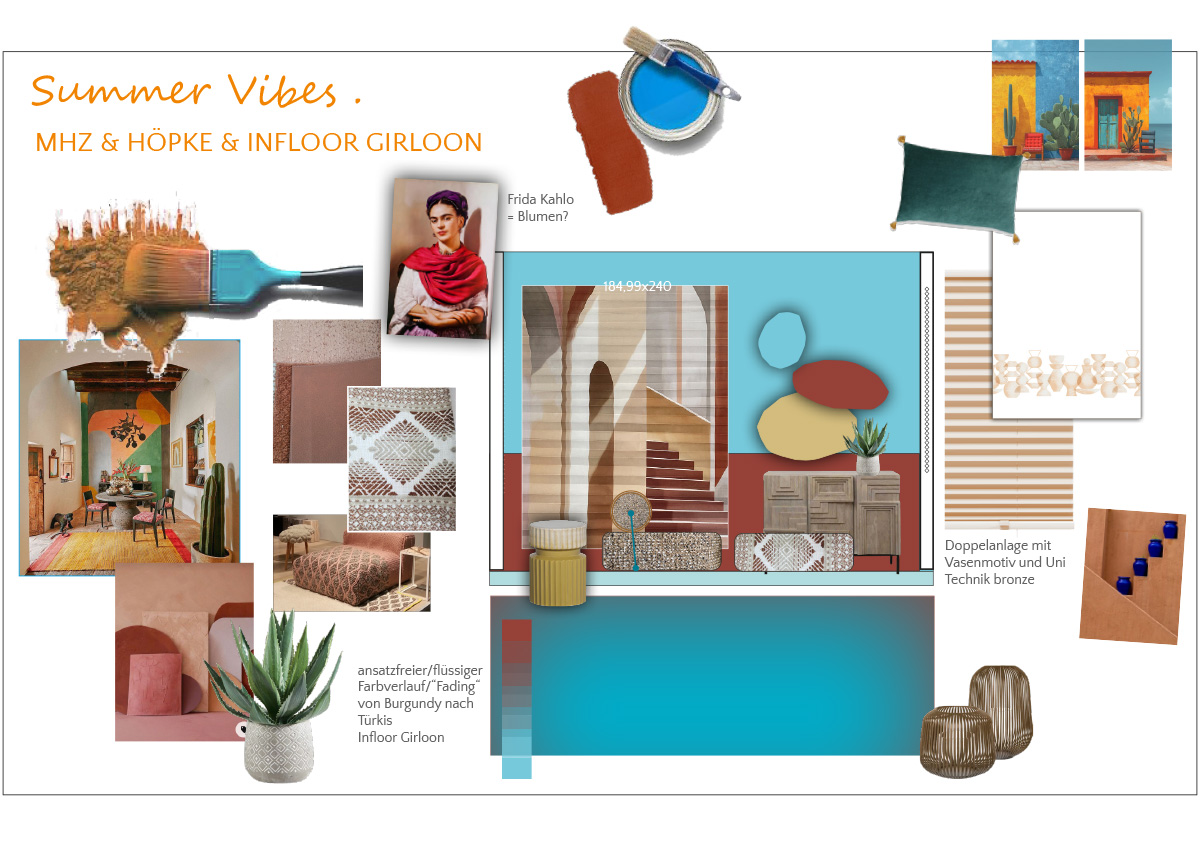 Summer Vibes steht für einen sommerfrischen Look mit fröhlichen wie auch künstlerischen Prints, frechen Streifen, Unis, feinen Strukturen und Leinenoptiken in Peach, Orange, Cotto, Gelb und Blau-Weiß. Das ist Urlaubsfeeling für Zuhause – und das im ganzen Jahr!