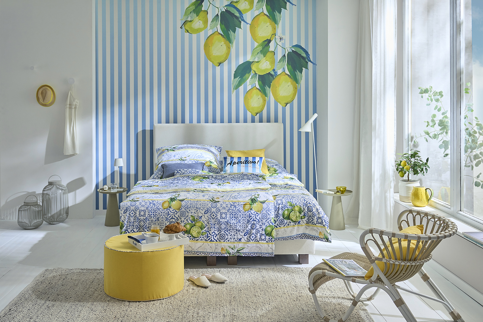 Diese Farben machen einfach gute Laune: sattes Zitronengelb, frisches Azurblau – das Interieur sprüht vor Energie und Sommerlaune. Die Design-Bettwäsche „Aurora“ von Apelt, die dekorative Tapete, der sonnengelbe Pouf und die bunt gemusterten Kissen setzen spielerische Akzente und bringen das Summer-Vibes-Feeling direkt nach Hause- und das im ganzen Jahr! Der gewebte Struktur-Teppich “Playa Perla” (Paulig since 1750) und “Easy” ein halbtransparenter Vorhang in Leinenoptik, rahmen das Ensemble in sanften Naturtönen harmonisch ein – und lassen die Farben umso intensiver leuchten.