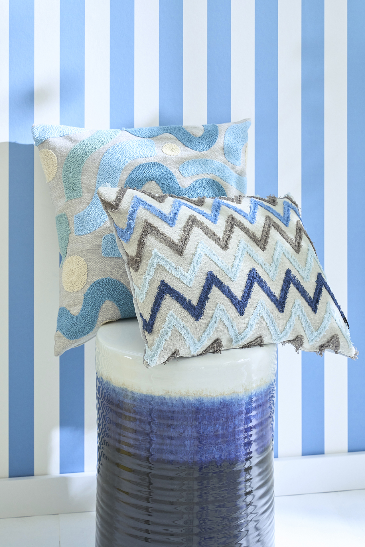 Bei Summer Vibes dürfen Kissen nicht fehlen. Sie sind die stillen Styling-Stars des Interieurs: wandelbar, charmant und echte Stimmungsmacher. Manche wirken fast wie textile Objekte, wie „Malva“ (hinten) und „Ravenna“ aus der Edition Unique von Apelt. Ihre fantasievollen Formen und das markante Zickzack-Muster sind aufwendig in Multicolor-Stickerei gearbeitet. Die hochwertigen Kissenhüllen überzeugen mit einer edlen Samtrückseite und einem praktischen Reißverschluss – Design und Komfort in perfekter Balance.