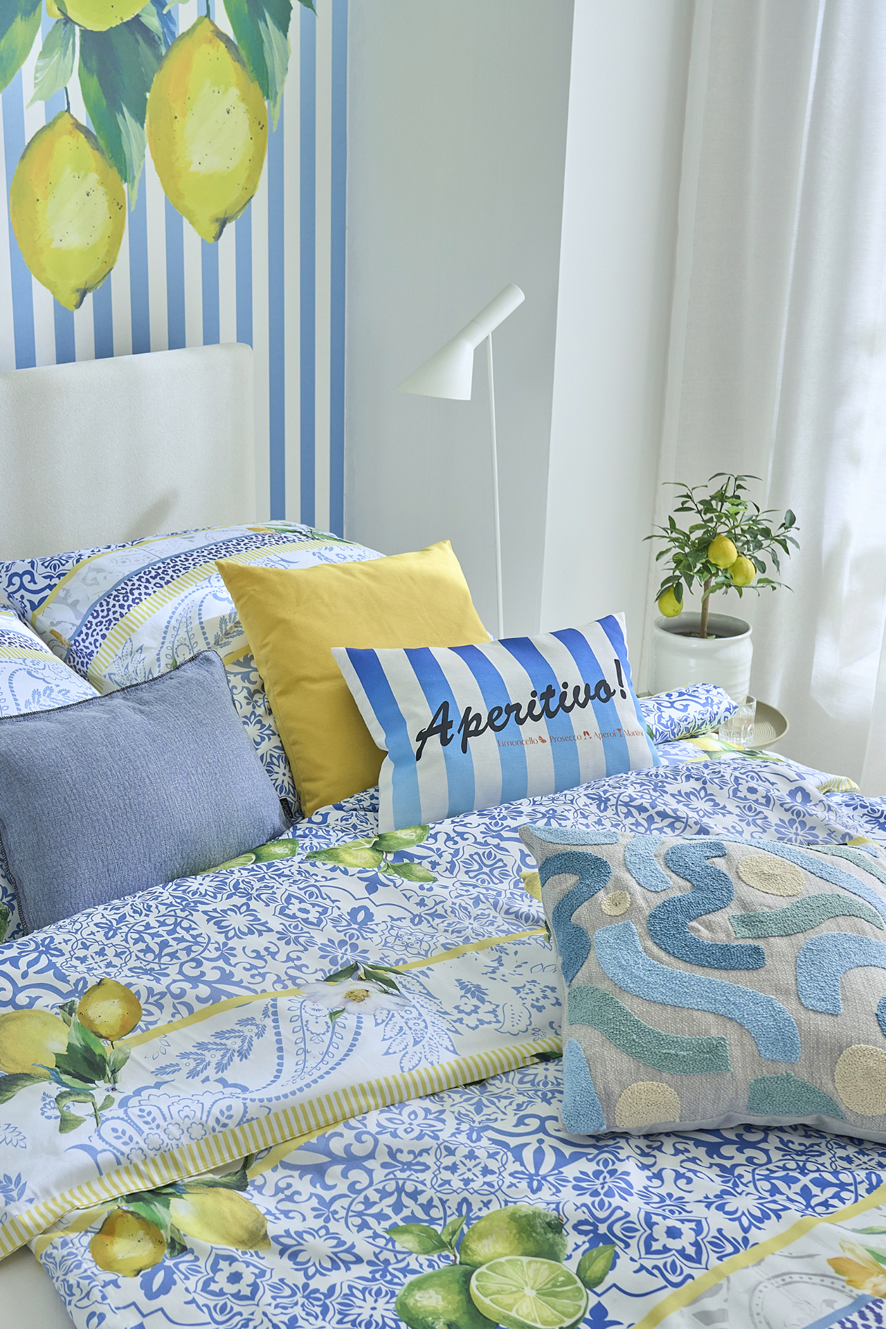 In der Design-Bettwäsche „Aurora“ lässt sich von Bella Italia und der Amalfiküste träumen. Der außergewöhnliche Mustermix aus Streifen, Paisleys und Ornamenten, kombiniert mit scheinbar lässig verstreuten Zitronen und Limetten, versprüht pure Lebensfreude. Aurora ist ein echtes Summer-Vibes-Statement – frisch, mediterran und ein dekoratives Highlight für den Schlafbereich, das jeden Morgen ein bisschen nach Sommer duften lässt.
