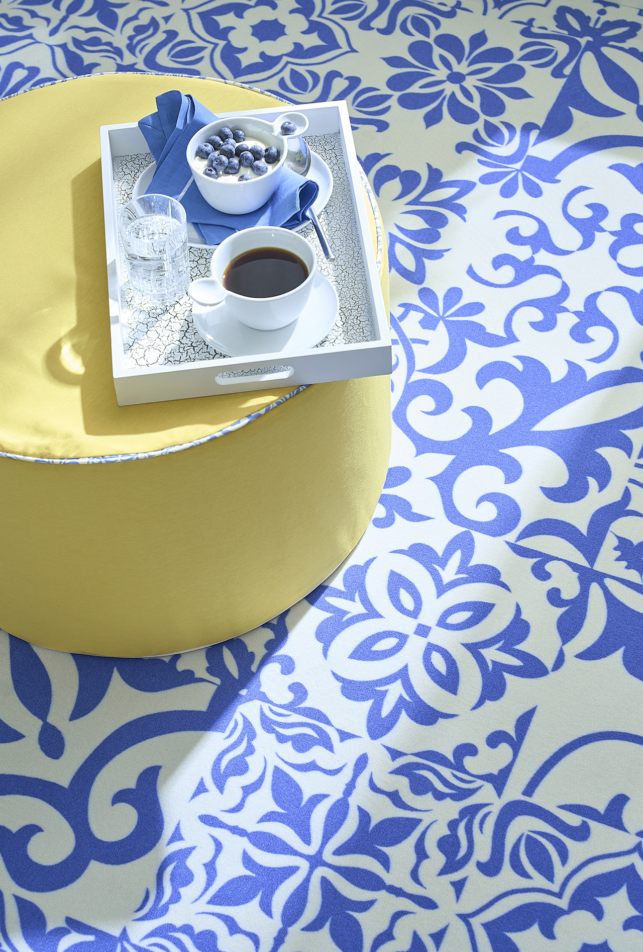 Ein Boden, der sofort Lust auf Urlaub macht: Der digital bedruckten Feinvelours-Fliesen von Infloor-Girloon erinnern an kunstvolle Azulejo-Muster aus dem Mittelmeerraum und verbindet die luxuriöse Haptik eines textilen Belags mit der Ästhetik traditioneller Handwerkskunst. Der leuchtend gelbe Sitzpouf setzt dazu einen frischen Akzent – bezogen mit einem Hightech-Stoff aus der Apelt Outdoor-Kollektion.