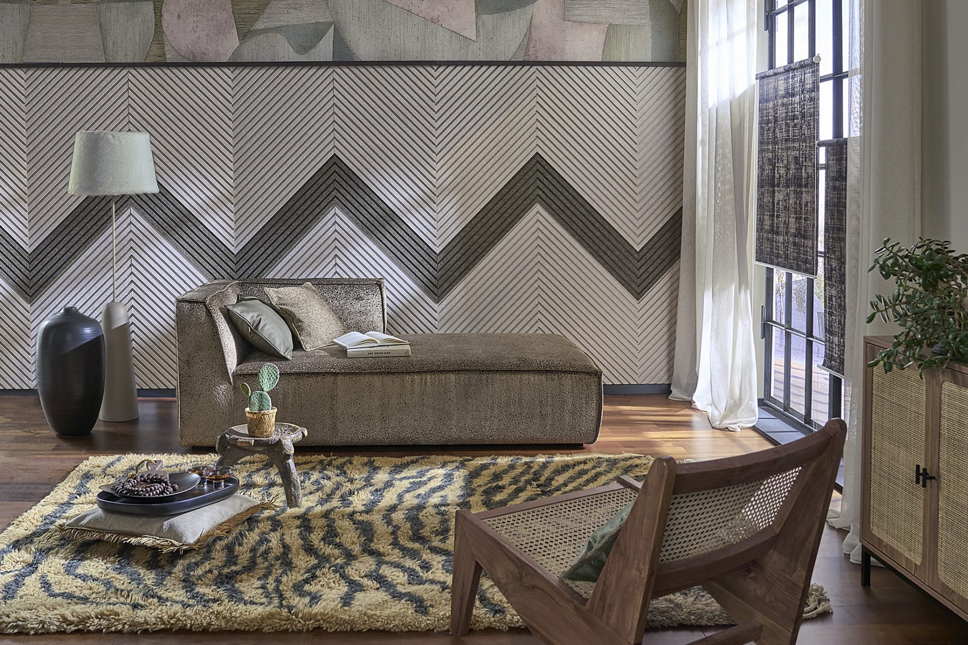 Ausdrucksstarker Muster-Mix, lässig und wild – gleichzeitig in sich stimmig und harmonisch. Hier sind Ethno Vibes nicht nur sichtbar, sondern spürbar. Die fein abgestimmten Tonalitäten sorgen für eine warme, wohltuende Raumstimmung. Der hochwirksame Schallabsorber aus der Lautloz-Serie von Buchheister, hier als Wandelement, bringt großen akustischen Komfort. Die Lautloz-Elemente sind vielfältig einsetzbar – hier als individuelle Wandgestaltung in moderner bicolor Fischgrat-Optik, kombiniert mit einer chicen Tapete im Ethno-Style.