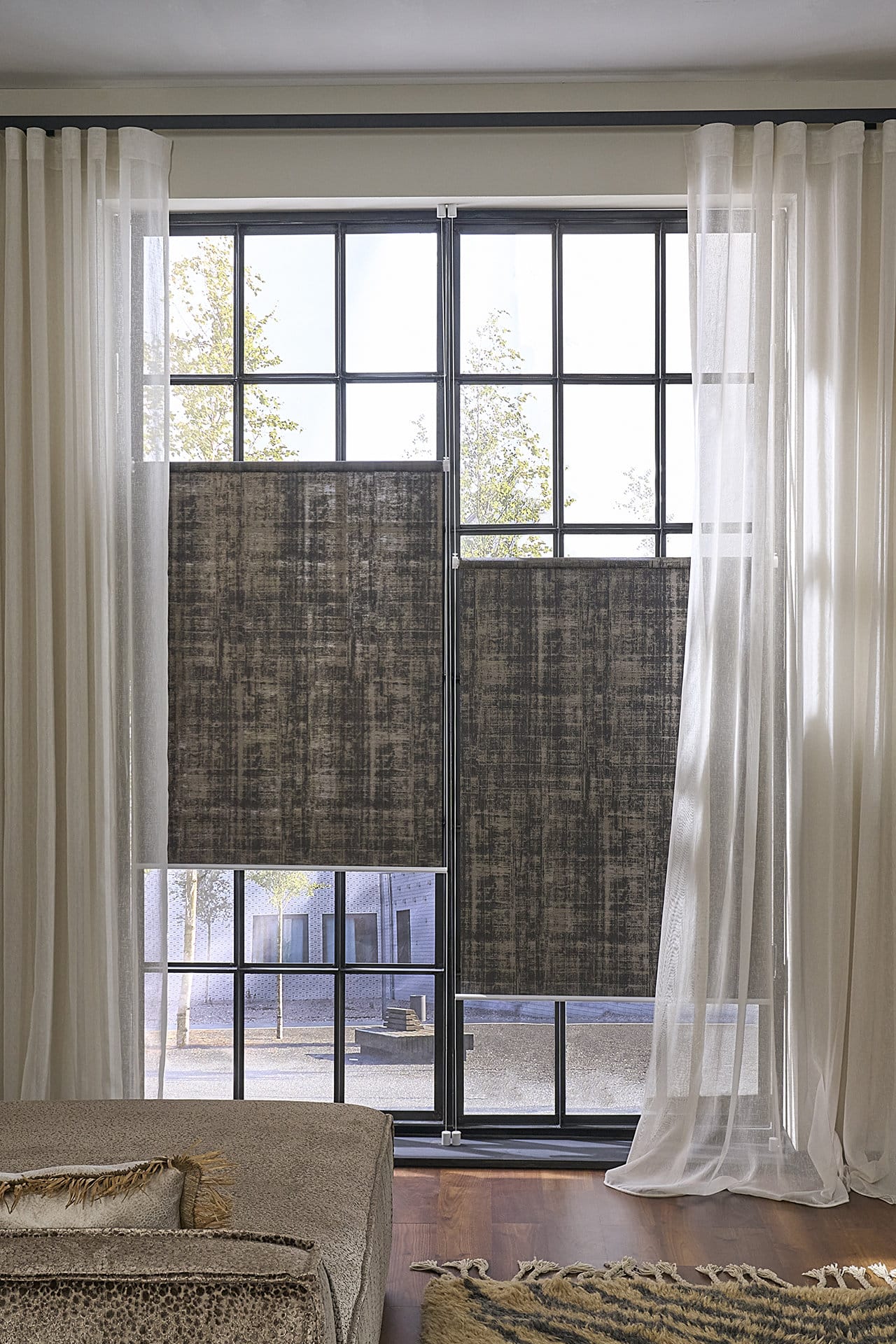 Fenster-Fashion à la Buchheister: Das neue “Flex” Maßrollo, hier mit einem Stoff in Ethno-Erdtönen, passt perfekt zu dem halbtransparenten Store aus der Fabrix Kollektion. Er ist akustisch wirksam, schwer entflammbar – in Kombination mit der filigranen Design-Vorhangstange “Slim” ein moderner stylischer Look.