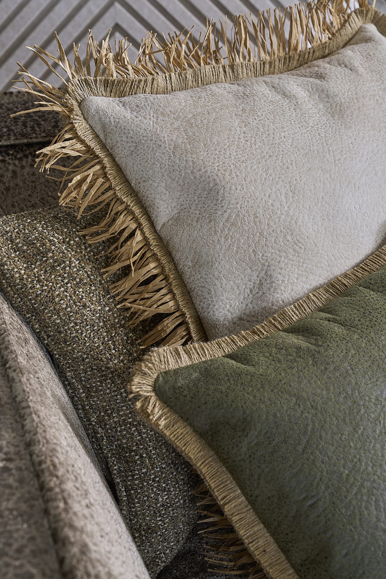 Ein bisschen mondän, etwas extravagant und luxuriös – hier zeigt das Thema Ethno-Vibes und Höpke Textiles sein Styling-Spektrum. Die Kissen spielen mit unterschiedlichen Materialien, Oberflächen und Strukturen. Die Farbwelt reicht von Sand über warmes Braun-Melange bis hin zu sanftem Oliv. Veredelt werden die Kissen durch Borten aus Sisal und Bast – ein raffiniertes Detail, das dem Look einen Hauch Extravaganz verleiht.