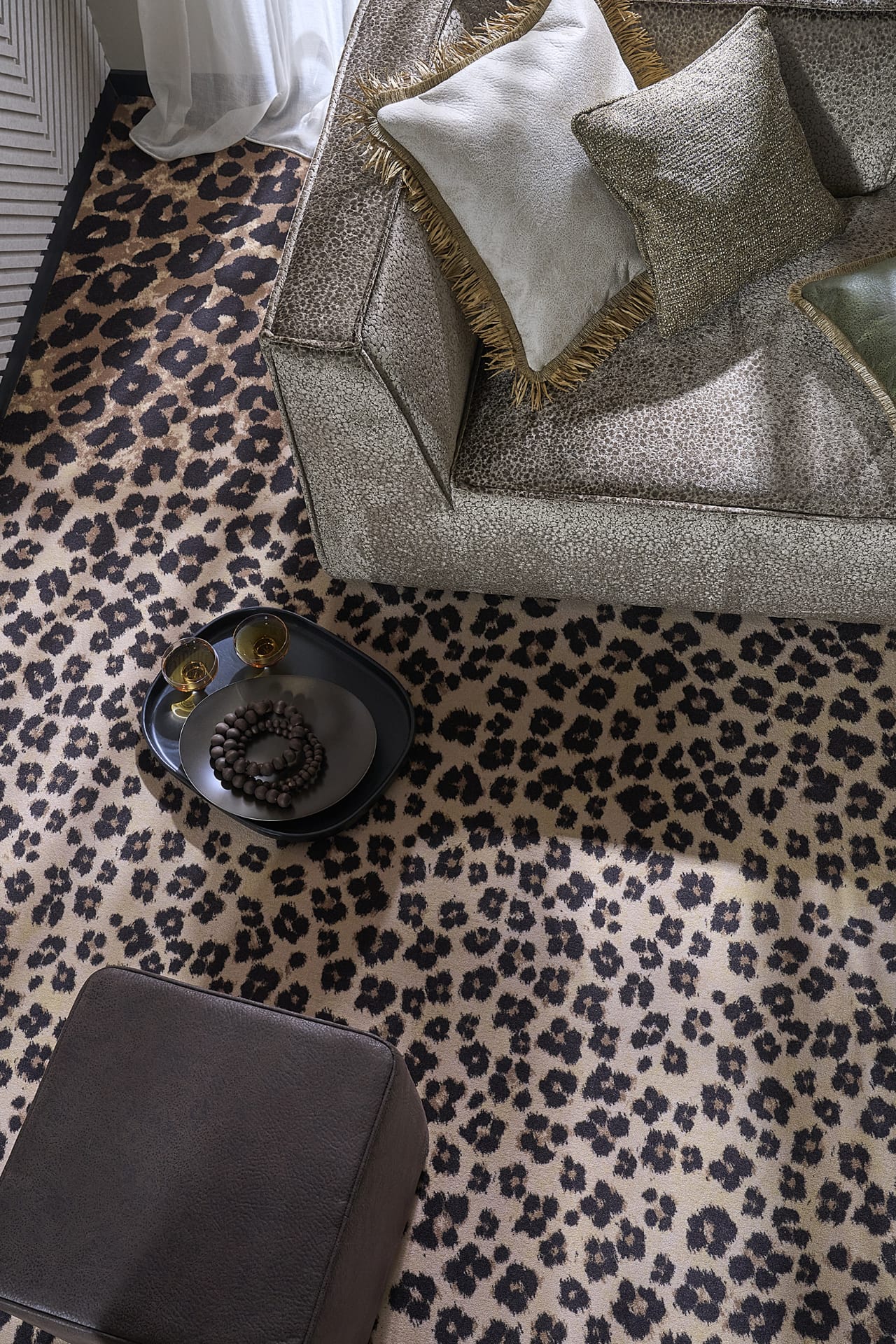 Ein Boden mit Wow-Effekt. Der digitalbedruckte Velours-Teppichboden “Leo” von Infloor Girloon ist ein echtes Statement im Raum. Der Animal-Print wirkt grafisch und edel zugleich und bietet die perfekte Bühne für die Recamiere, die mit dem eleganten Microvelours “Salea 152” von Höpke Textiles in Leo-Optik bezogen ist. Das perfekte Zusammenspiel von Style, Komfort und purem Wohlgefühl.