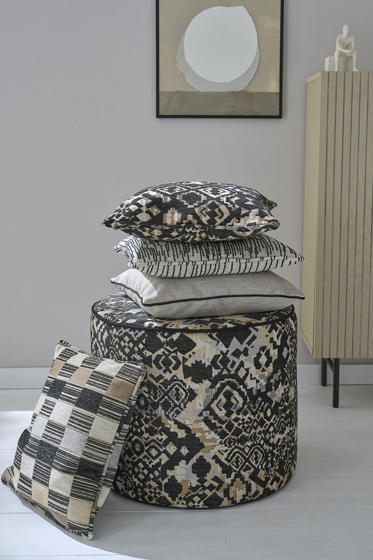 Ein Hauch Ethno, ein bisschen Boho – und ganz viel Wohlgefühl. Sitzpouf und Kissen zeigen, wie Stoffe Atmosphäre schaffen können. Die Möbelstoffe von Höpke (Twister 955”, “Domino 915”, “Mikado 985”, “Vivo 610”) spielen mit Mustern und Farben, die harmonisch aufeinander abgestimmt sind. Der Pouf mit seinem großzügigen Dessin wird zum Statement Piece, während die Kissen die Farbwelt sanft wieder aufnehmen. Alles wirkt entspannt, handwerklich, wertig.